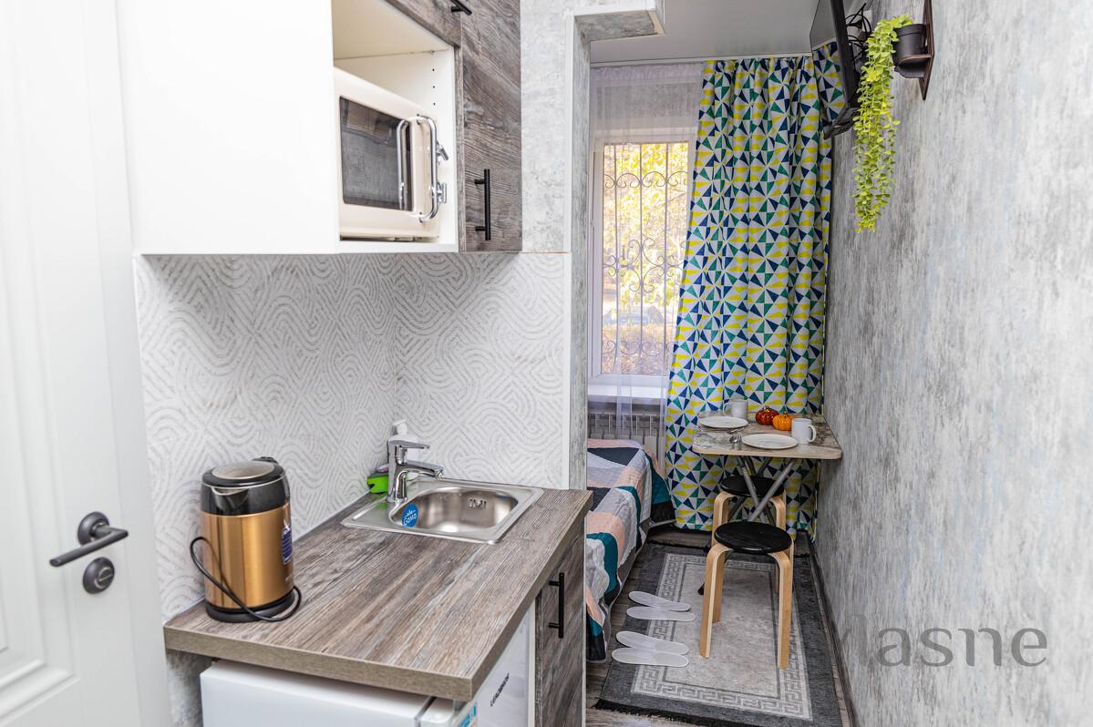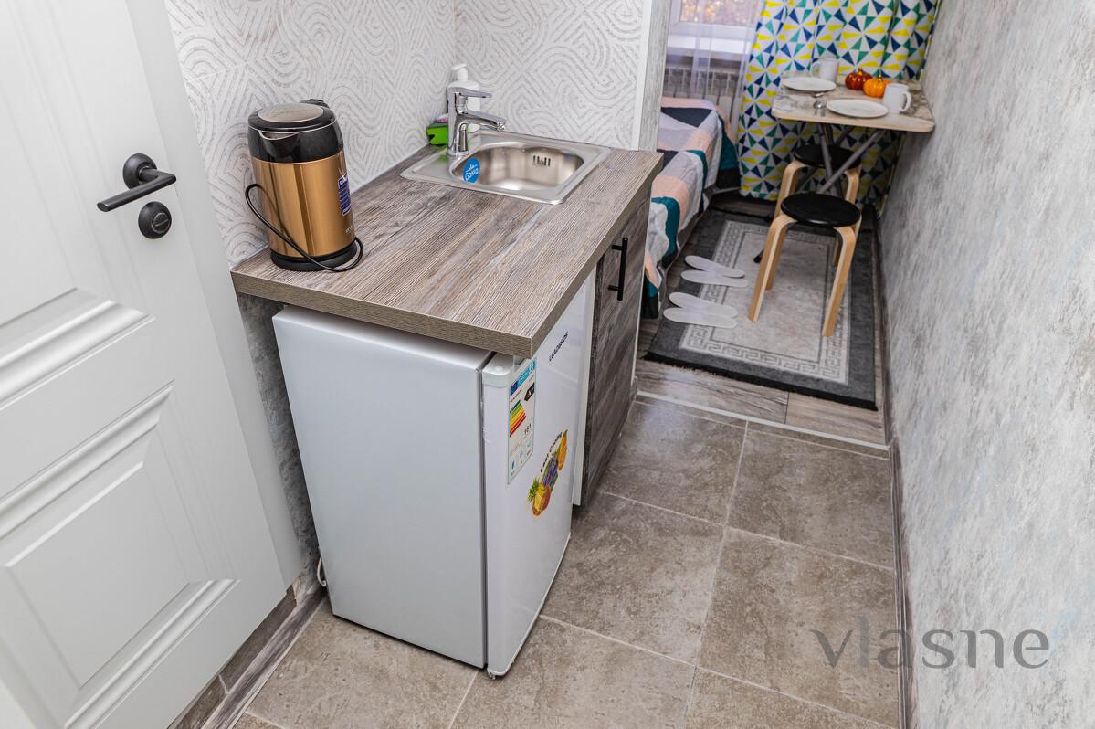 Studio is a room with a kitchenette and its own bathroom. Budget option with hotel service for a stylish, cozy, well-thought-out studio for two! Perfect for business travelers, city guests, couples. The studio has everything for a comfortable stay for 1-2 people: - area 10 sq.m. - clean, fresh bed linen and towels - double bed - fast and stable wi-fi, TV - kitchen area with household appliances and utensils - bathroom with shiny plumbing - ironing board, iron, hair dryer, washing machine - security - metal front door - a full package of travel documents with a guarantee that your accountant will accept everything! ​Only 4 studios per floor.