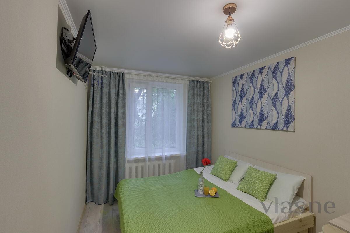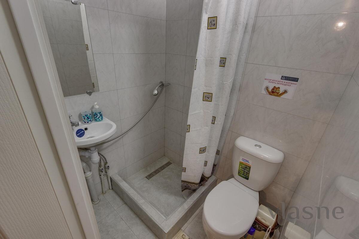 Studio is a room with a kitchenette and its own bathroom. Budget option with hotel service for a stylish, cozy, well-thought-out studio for two! The studio has everything for a comfortable stay for 2 people: - area 15 sq.m - clean, fresh bed linen and towels - double bed - fast and stable wi-fi, TV - kitchen area with household appliances and utensils - bathroom with shiny plumbing - ironing board, iron, hair dryer, washing machine - security - metal entrance door - a full package of travel documents with a guarantee that your accountant will accept everything! Only 4 studios per floor.