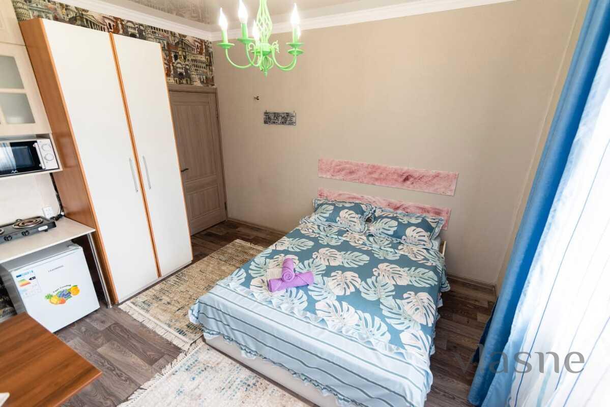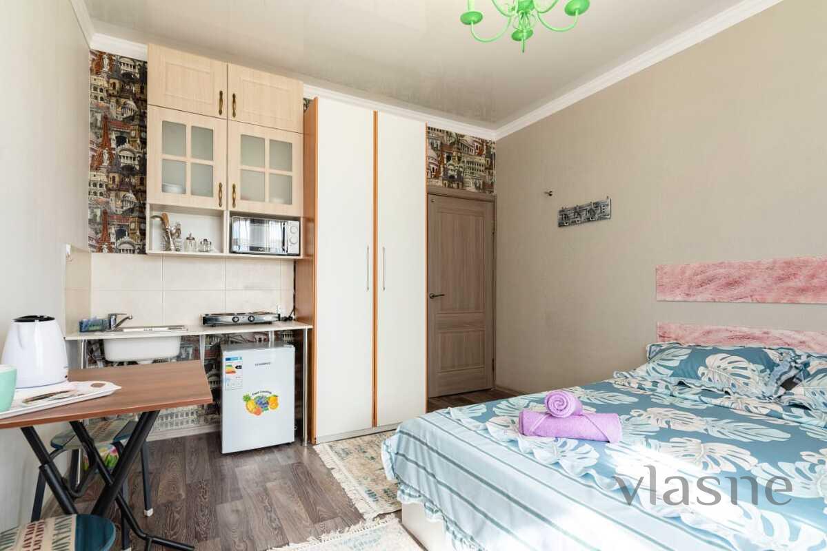 Studio is a room with a kitchenette and its own bathroom. An excellent option with hotel service for a double, stylish, cozy, well-thought-out studio! The studio has everything for a comfortable stay for 2 people: - 5th floor out of 9, new free elevator - area 25 sq.m - clean, fresh bed linen and towels - double bed - fast and stable wi-fi, cable TV - kitchen area with household appliances and dishes - bathroom with shiny plumbing, bath - ironing board, iron, hair dryer, washing machine - security - metal front door - soundproofing - full package of travel documents with a guarantee that your accountant will accept everything! ​Only 3 studios per floor.