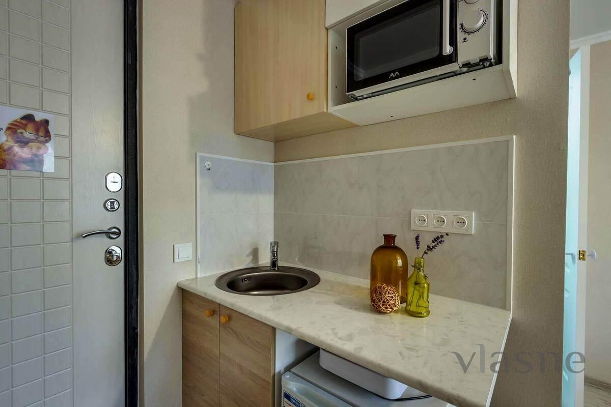 Studio is a room with a kitchenette and its own bathroom. Budget option with hotel service for a stylish, cozy, well-thought-out studio for two! Perfect for business travelers, city guests, couples. The studio has everything for a comfortable stay for 2 people: - area 17 sq.m - clean, fresh bed linen and towels - double bed - fast and stable wi-fi, TV - kitchen area with household appliances and utensils - bathroom with shiny plumbing - ironing board, iron, hair dryer, washing machine - security - metal entrance door - a full package of travel documents with a guarantee that your accountant will accept everything! ​Only 4 studios per floor.