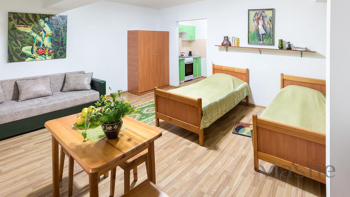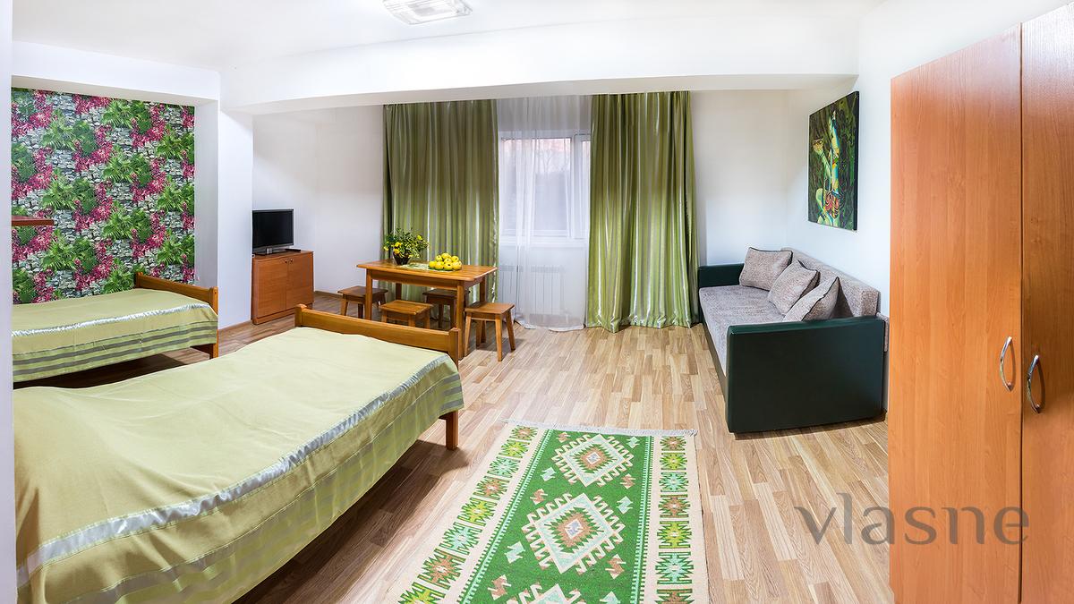 Spacious studio apartment in a new, modern residential complex. The windows overlook a quiet courtyard. In the living room sleeps 4: two wide bed lorry and chic folding sofa. Comfortable, spacious wardrobe. And a seating area with a dining group. The apartment has cable TV, high speed internet, iron and ironing board, hair dryer, electric kettle, microwave, refrigerator and utensils.