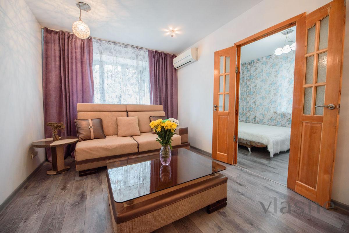 At your service are fresh bedding, clean terry towels, disposable slippers and toothbrushes, a hairdryer, hangers, shampoo, shower gel, a guide to the sights of Almaty. There is everything you need for your comfortable stay - equipped kitchen with all utensils for cooking and eating, modern appliances, furniture, high-speed Wi-Fi Internet, 2 SMART TVs with Internet, air conditioning, drinking water, tea, coffee. Convenient transport accessibility, nearby grocery stores, cafes, modern Vilka steak house. A 10-minute accessibility on the central street of Abay is a modern fitness center "Rakhat" with a 50 m swimming pool, a central stadium, a registry office, a shopping center "Promenade", a polytechnic university, a circus, a children's amusement park "Fantasy World", where you can relax and take a walk in any time in an area with developed infrastructure. Russian, Kazakh and English-speaking owners. We guarantee you safety, full awareness and only the real value of the offered apartments. You can find out more detailed information about the provided apartment from us by contacting us on the indicated phones.