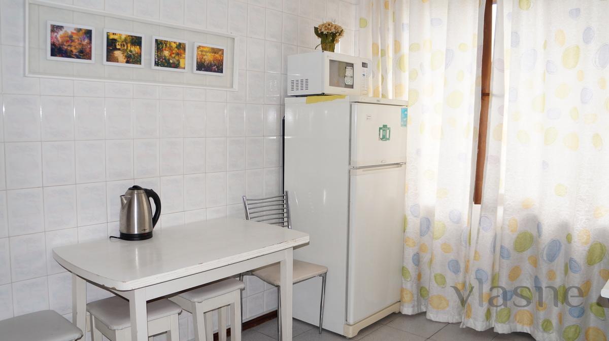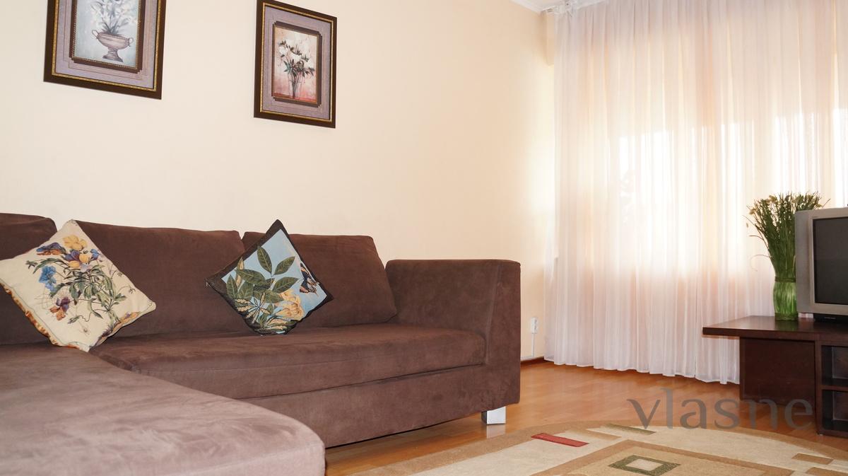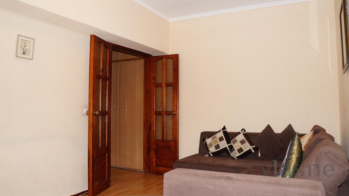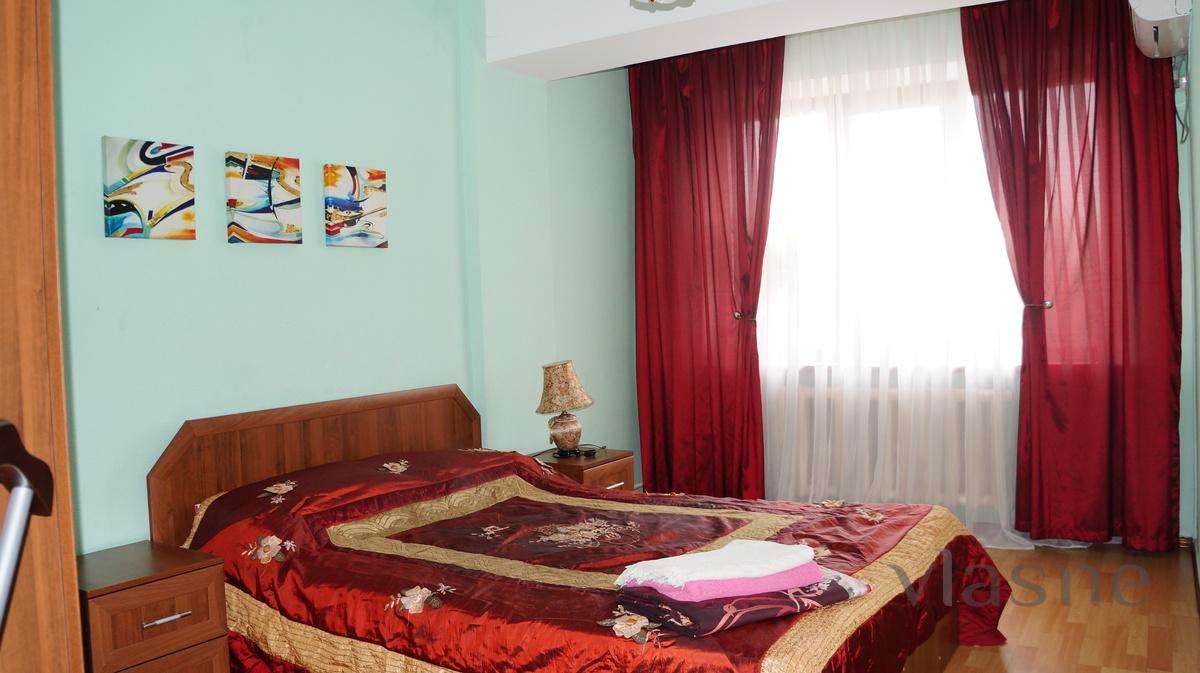 2-bedroom apartment in downtown Almaty (Dostyk ave., HS. Satpaev str.); 3 (3), bedroom + living room (3 beds), good condition, air conditioning, fully furnished, all appliances, cable TV (digital TV), internet access (WiFi), clean, comfortable, documents for reference, registration, transport services (airport, railway station), support of the city (hourly).
